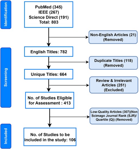 To ensure the inclusion of high-quality and peer-reviewed research, the study employed a quality-filtering criterion based on the Scimago Journal Rank (SJR) and Journal Citation Reports (JCR) quartile (Q) indexing systems. In this review, only articles published in journals indexed in SJR or those with JCR quartile rankings (Q1–Q4) were considered eligible for inclusion. Studies published in journals not indexed in either SJR or JCR, or lacking identifiable quality metrics, were classified as “Non-SJR/Q” and consequently excluded. The SJR metric reflects the scientific influence of scholarly journals by accounting for both the number of citations received and the prestige of the citing journals, while the JCR-Q system ranks journals from Q1 (highest impact) to Q4 (lowest) based on citation distributions. This quality screening ensured that the included literature represented peer-reviewed, credible, and widely recognized sources within the scientific community. Furthermore, conference papers, pilot studies, non-English articles, and inaccessible manuscripts were excluded to maintain methodological rigor and focus on reproducible, peer-reviewed work.