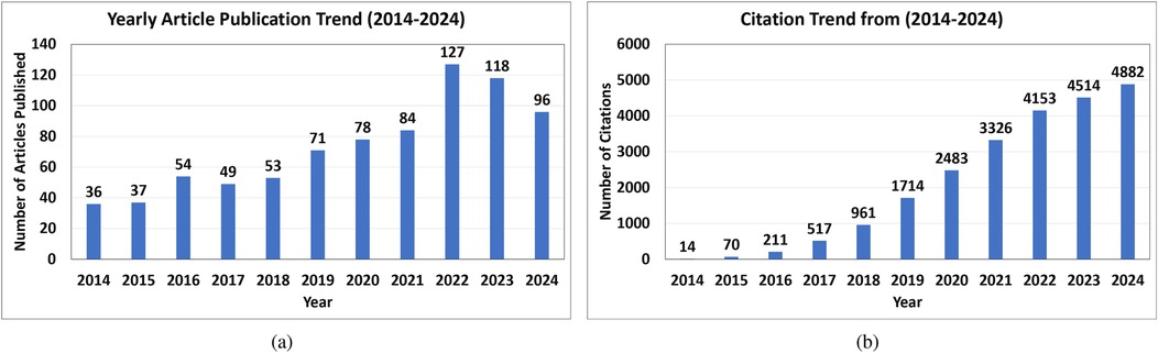 We used the Preferred Reporting Items for Systematic Reviews and Meta-Analyses (PRISMA) criteria to find studies pertinent to the classification of ECG beats (41). Articles published up until April 2024 utilizing the terms “Electrocardiogram,” “ECG beat Classification,” “Artificial Intelligence,” “Machine Learning,” and “Deep Learning” in their respective Boolean combinations were searched for in the PubMed, Institute of Electrical and Electronics Engineers Association (IEEE), and Science Direct databases. The authors excluded non-English publications, duplicate titles, irrelevant works, review articles, pilot studies, non-accessible articles, and articles published before 2014 (42). Thus, this study consisted of 106 articles that focused on AI-based ECG beat classification. Figure 3 shows the detailed search method, which was compliant with the PRISMA criteria (42). In Figure 4, it can be observed that the yearly article publication trend (2014–2024) and yearly citation trend (2014–2024) for ECG beat classification indicate a strong and growing research interest in this domain. The publication trend shows a steady increase in the number of articles, which peaked in recent years (2022–2024), highlighting the expanding focus on deep learning, signal processing, and patient-specific classification approaches. This growth suggests an increasing number of researchers contributing to advancements in ECG analysis. A peak in citations often follows high publication periods, indicating that time is required for newer methods to be widely cited. These trends emphasize the need for continued innovation and the adoption of novel approaches to sustain research in ECG beat classification.