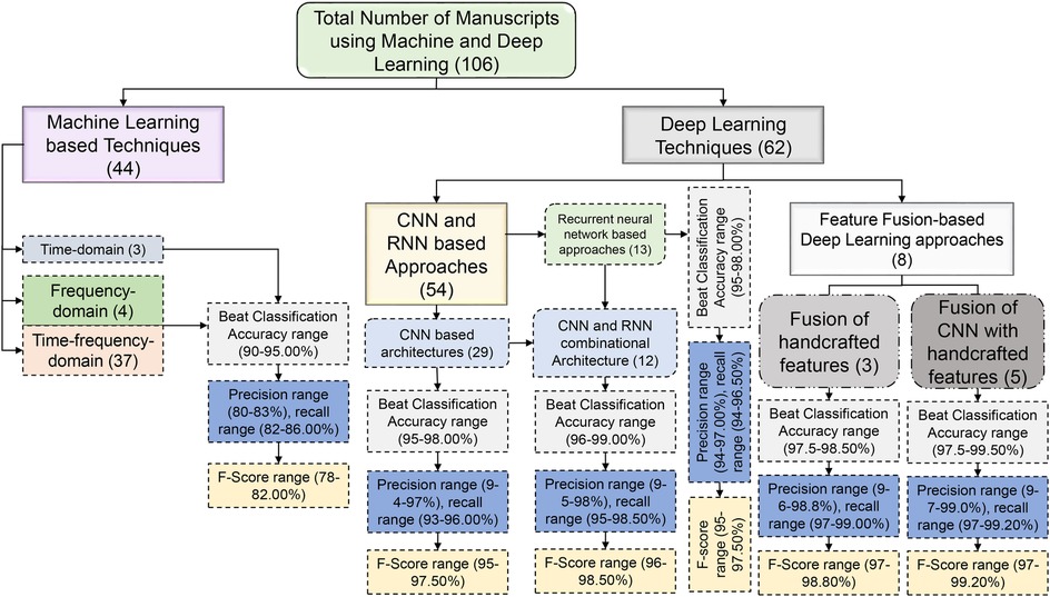 The primary focus of this research was to thoroughly explore the extensive range of machine learning and deep learning methodologies employed in the context of ECG beat classification. Arrhythmia is a condition characterized by irregular heartbeats, either too fast or too slow, that disrupt the normal functioning of the heart (2). The heart has a natural pacemaker that sets the rhythm of the heartbeats. However, any disturbances in electrical impulses can result in arrhythmia. There are many cardiac arrhythmias, each with unique characteristics and potential complications. Early detection and treatment of arrhythmias can help prevent serious complications such as stroke or sudden cardiac arrest. Significant cardiac arrhythmias include (i) atrial fibrillation (AF), (ii) ventricular tachycardia (VT), (iii) sinus bradycardia (SB), (iv) atrial flutter (AFT), (v) ventricular fibrillation (VF), and (vi) supraventricular tachycardia (SVT) (34). An irregularity in the upper chambers of the heart causes AF, which in turn causes blood clots, stroke, and heart failure (35). A fast heart rate that starts in the ventricles (the lower chambers of the heart) will produce VT beats. It can cause dizziness, chest pain, and fainting. If left untreated, it can also lead to sudden cardiac arrest. SB is a slow heart rate that originates in the sinoatrial node (SA). It can cause fatigue, dizziness, and fainting. AF is an irregular heart rhythm caused by electrical activity in the atrial chambers of the heart. The atrial rate is generally between 250 and 350 beats per minute and is quick and regular. Since the atrioventricular (AV) node slows down electrical impulses, the ventricles (the lower chambers of the heart) can also beat rapidly (34).