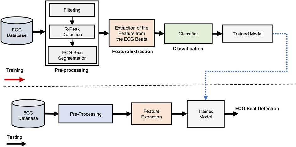 ECG recordings are classified into two types based on the recording duration, i.e., resting and ambulatory ECG (10). A resting ECG contains only 5 to 10 min of heart function data recording, whereas an ambulatory ECG records 24–48 h of information (11). Detecting abnormal episodes from this enormous quantity of data is very difficult. Therefore, effective automated diagnosis tools are required to detect important episodes in cardiac patients. Initially, we used template-based and rule-based techniques that are usually utilized to detect the type of ECG beat (12–17). Rule-based approaches rely on predefined rules and thresholds to classify ECG beats. These rules are often based on expert knowledge or heuristics. However, these rules may not be able to handle the wide range of variations and complexities observed in real-world ECG signals. As a result, rule-based approaches may struggle to adapt to different types of beats or handle new patterns that were not considered during rule creation (18). Developing accurate and comprehensive rules for ECG beat classification can be challenging. It requires a deep understanding of ECG signal characteristics and considerable domain expertise. Designing rules that cover all possible scenarios and variations is complex and time-consuming. Rule-based approaches are typically designed to classify beats based on specific features or patterns (19). They may struggle to generalize well to new or unseen data that do not conform to the predefined rules. The rule-based classifier can produce incorrect or inconsistent results if the ECG data deviates from the expected patterns. A set of templates representing different types of beats is required in template-based approaches (13). Choosing appropriate templates that accurately represent the various beat morphologies in ECG signals can be challenging. There is a need to consider inter-subject and intra-subject variability and variations due to different conditions and diseases (12). The classification in template-based approaches relies on comparing the input ECG beat with a set of templates to find the best match. However, template matching can be sensitive to noise, baseline wander (BW), and other artifacts present in the signal (20). These issues can affect the accuracy of the match and lead to misclassification. Template-based approaches often struggle with scalability when dealing with large datasets or real-time applications (17). Comparing each beat with a set of templates can be computationally expensive, especially if the number of templates is high. The time complexity increases as the number of beats and templates grows, making it impractical for large-scale applications (21).