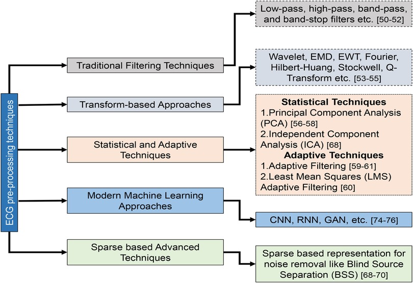 Pre-processing is the initial and critical stage in ECG beat classification systems, aiming to enhance the quality of the raw ECG signals (Table 5). This stage is essential to mitigate the impact of noise and artifacts that can obscure the true physiological information in the ECG data. Pre-processing technique details and their categorization are illustrated in Figure 7. Common sources of noise include baseline wander, powerline interference (PLI), and muscle artifacts (MAs) (36). Techniques such as bandpass filtering, wavelet transforms, and normalization are employed to remove or reduce these interferences. In addition, this stage may involve the segmentation of the ECG signal into individual beats, setting the foundation for accurate feature extraction and classification in subsequent phases. First, the raw ECG signal is filtered to eliminate unwanted noise and artifacts in the preprocessing stage (35). The next step is to separate the signal into individual heartbeats, often identified by the R-peaks in the ECG. In the feature extraction phase, data from each heartbeat are parsed for various features based on its time domain, frequency domain, and morphology. Heartbeat rhythms and shapes are characterized using these properties, which can be utilized to identify certain arrhythmias. Classification involves applying machine learning methods to the retrieved attributes of individual heartbeats (90). The basic techniques for pre-processing ECG signals can be summarized as follows: classical filtering techniques, transform-based techniques, statistical and adaptive techniques, modern machine learning approaches, and advanced techniques.