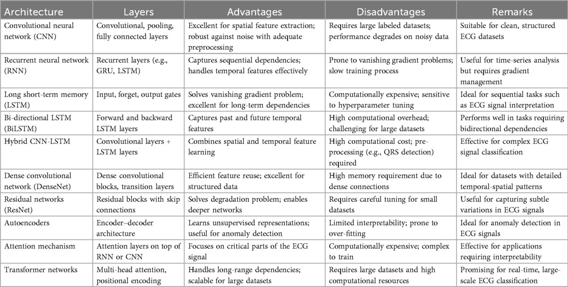 Deep learning models can automatically learn relevant features directly from the raw ECG signals, eliminating the need for manual feature engineering. This feature learning process enables the model to capture intricate patterns and complex relationships that may be difficult to capture using handcrafted features (18, 19, 25–28). Deep learning models can learn hierarchical representations of ECG signals, allowing them to extract meaningful features at different levels of abstraction. The different deep learning architectures and their advantages in the extraction of meaningful features are presented in Table 1. Deep learning models are known for generalizing unseen data well. They can learn from large amounts of labeled ECG data and capture the underlying patterns that are characteristic of different beat types. Deep learning models can handle large-scale ECG datasets efficiently (20). Once trained, the models can process ECG beats quickly, making them suitable for real-time applications. In addition, deep learning models can be deployed on parallel computing architectures, such as graphical processing units (GPUs), to improve computational performance, enabling rapid and scalable ECG beat classification (9, 18). Deep learning models can be updated and fine-tuned with new data to improve performance and adapt to changes in ECG signals (25). This ability for continual learning allows the model to incorporate new knowledge and adjust its classification capabilities as new data become available. It enables the model to stay up-to-date with the emerging beat types or changes in the data distribution (28). Deep learning models can adapt and generalize well to new beat types and variations not encountered during training. The models can discover and classify novel patterns and variations by learning from diverse examples. This adaptability makes deep learning models suitable for dynamic environments where ECG data may evolve.