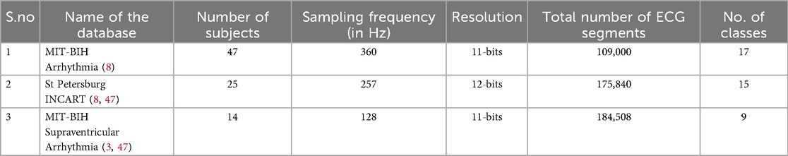 In the literature, the majority of the studies have used three different ECG databases to verify how effectively ECG beat classification methods perform, namely, the Massachusetts Institute of Technology—Beth Israel Hospital (MIT-BIH) arrhythmia (8), St. Petersburg Institute of Cardiological Technics (INCART) (8), and MIT-BIH supraventricular arrhythmia (3) databases. A summary of these three databases is shown in Table 2. Table 3 presents a detailed breakdown of the manuscripts that utilized various ECG beat classification databases. It further highlights the use of the three prominent databases—MIT-BIH Arrhythmia, INCART, and MIT-BIH supraventricular—across three major publishers: Elsevier, IEEE, and Springer. In addition, it includes lesser-known databases such as the American Heart Association (AHA) and MIT-BIH Long-Term ECG, which are used for specialized research in arrhythmia detection. This table helps to identify trends in database usage for ECG classification in the scientific community.