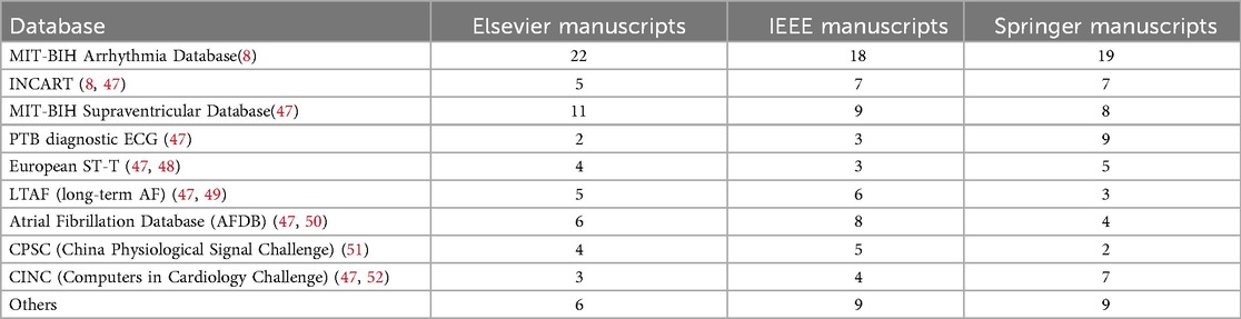 Table 3. Estimated number of manuscripts using various ECG beat classification databases from different publishers.