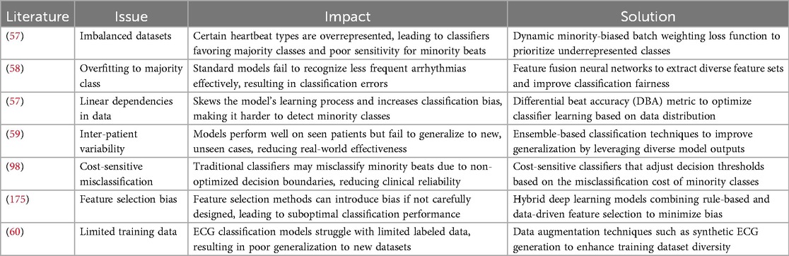 Bias in machine learning refers to systematic errors that cause a model to make consistently incorrect predictions, often favoring certain patterns while neglecting others (56). Bias can arise due to several factors, such as imbalanced training data, poor feature selection, or overly simplistic model assumptions that fail to capture the true complexity of the data (19). Bias in ECG beat classification is a critical issue, often stemming from imbalanced datasets where certain heartbeat types are overrepresented while others are underrepresented. This imbalance can lead to classifiers favoring the majority class, resulting in poor sensitivity for minority classes, such as supraventricular and fusion beats (57). One study demonstrated that standard classification models trained on imbalanced datasets tend to overfit the majority class while failing to recognize less frequent arrhythmias effectively (58). This issue is exacerbated by linear dependencies in ECG data, which further skew the model’s learning process and introduce classification bias (57). Moreover, the impact of inter-patient variability, where models perform well on seen patients but fail to generalize to unseen cases, further contributes to biased ECG classification (59). A detailed overview of certain issues due to bias is presented in Table 4.
