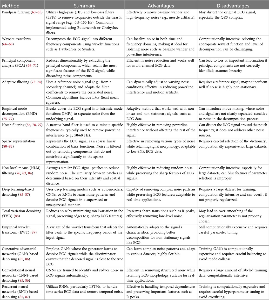 In ECG signal processing, significant noise artefacts pose a considerable challenge to the accurate analysis and interpretation of ECG signals. These extraneous disturbances can stem from various sources, including muscular activity, electromagnetic interference, electrode impedance, and baseline drift. Consequently, faithful extraction of relevant physiological information from noisy ECG recordings becomes critical, demanding innovative signal processing techniques (29). ECG recordings are generally mixed with different noises during acquisition from cardiac patients. Pre-processing techniques are crucial for the design of better classification systems. Identifying different fiducial points in ECG signals, such as P-onset and off-set, Q-onset and off-set, and T-onset and off-set, are difficult in noisy environments (91). Hence, the filtering of ECG signals without losing important information is a challenging task. The primary noise sources in ECG signal acquisition include MAs, caused by muscle contractions and tension, leading to irregular, high-frequency oscillations that distort the cardiac signal (7); electromagnetic interference (EMI) from electronic devices and power lines, causing voltage fluctuations and noise spikes (7); BW, gradual baseline shifts due to respiration or movement, obscuring low-amplitude cardiac components (92); PLI, visible as sinusoidal noise from electrical systems (9); MArs, high-frequency noise resulting from patient movements such as coughing or shifting positions (7); and electrode contact noise (ECN), resulting from poor electrode–skin contact, leading to signal distortion, especially during motion (2).