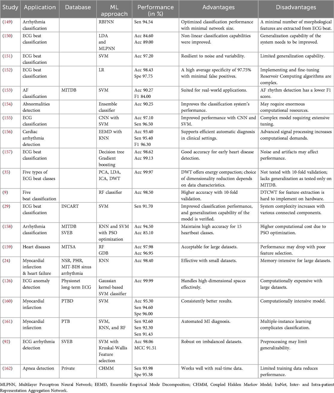 An overview of previous studies on the classification of ECG beats through the application of machine learning techniques is presented in Table 6. The table reviews various ECG beat classification techniques using machine learning models, highlighting their applications, databases, and performance metrics. Techniques such as radial basis function neural networks (RBFNNs), SVMs, and ensemble classifiers have been applied in datasets such as MITDB, PTBDB, and INCART, achieving accuracy rates from 84.60% to 99.99%. Each approach has specific advantages, such as resilience to noise and improved specificity, but also faces limitations, including increased system complexity or computational demands. Notably, classifiers such as SVM and RF consistently showed high performance, making them suitable for real-world applications; however, challenges in feature selection and model generalization were critical issues in different studies. After extracting the features from the ECG beats, artificial intelligence methods from machine learning can be used to build models from these data to classify arrhythmia heartbeats (43, 43–46). SVMs (126), ANNs (164), KNNs (24), and LDAs (165) are some of the most popular machine learning methods used for ECG beat classification. Despite noise and outliers in the ECG data, SVM continues to produce effective results because it finds the ideal hyperplane that maximizes the margin between distinct classes. Basic artificial neural network structures with fewer layers and parameters could improve interpretability, making it easier for clinicians to comprehend and have confidence in the model’s decisions when classifying ECG beats. The KNN algorithm is beneficial due to its simplicity and non-parametric nature, which makes it suited for small-to-medium-sized datasets and circumstances with extremely non-linear decision boundaries (24). However, when the classes in the ECG data are well-separated, LDA emerges as a linear classifier that strives to maximize the between-class variation while minimizing the within-class variance (165). Moreover, it is important to consider the dataset’s size, the task’s difficulty level, and the available processing resources before selecting an approach. Each algorithm has both advantages and disadvantages.