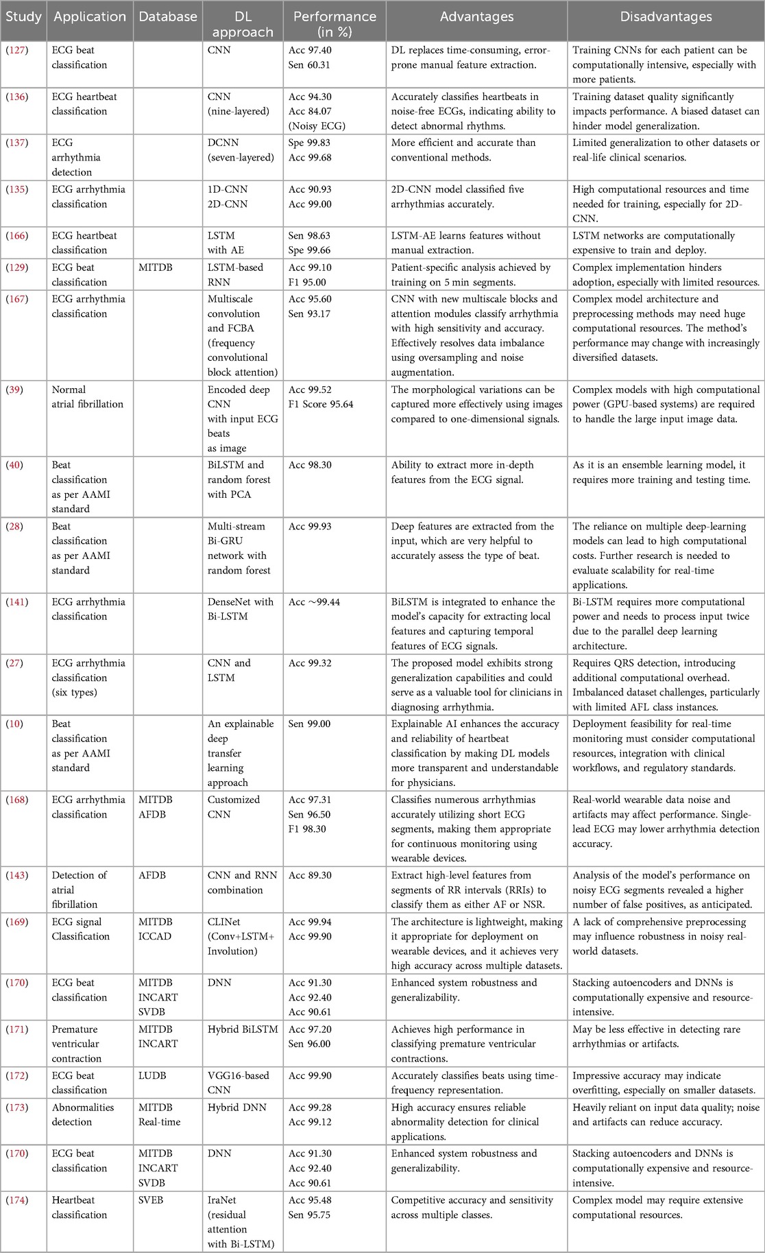 DL methods have various advantages over standard ECG beat classification algorithms, including automatically learning discriminative features from raw ECG data without manual feature extraction (18). With this automated feature extraction technique, DL models can better classify cardiac diseases by detecting intricate patterns and tiny variations in the data. Further, the temporal and sequential nature of ECG signals is well-suited to DL methods, especially RNNs and CNNs, enabling them to detect the long-range relationships and temporal patterns in heartbeats (25). Furthermore, DL models have also shown excellent generalization abilities, which means they can adapt to different patient groups and recording situations, which is very important for real-world clinical applications.