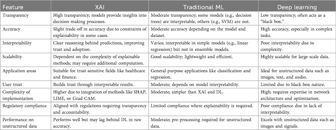 ECG beat classification using XAI leverages advanced machine learning techniques to enhance transparency in automated diagnostic systems. Traditional classification methods often function as “black boxes,” making it difficult for clinicians to interpret or trust decisions, especially in critical applications such as arrhythmia detection. Explainable AI addresses this limitation by employing methods such as saliency maps, feature importance visualization, and decision boundary analysis. These approaches allow for better understanding and verification of the features contributing to a model’s predictions. Techniques such as layer-wise relevance propagation (LRP) and gradient-weighted class activation mapping (Grad-CAM) have been applied to visualize critical regions of ECG signals, helping practitioners align model decisions with medical insights (177, 178). This not only improves diagnostic reliability but also aids in identifying potential errors in classification. Incorporating XAI into ECG beat classification aligns automated systems with real-world clinical requirements. Explainable methods enable the assessment of model predictions in handling class imbalances and morphological complexities in ECG datasets. Studies integrating XAI with neural networks, such as convolutional and recurrent architectures, have shown improved interpretability without compromising classification accuracy (58, 121). For instance, combining ICA with neural networks has demonstrated robust classification results with enhanced feature interpretability, achieving over 98% accuracy on benchmark datasets (98, 179). By bridging the gap between machine intelligence and clinician trust, explainable AI ensures that automated ECG diagnostic tools are not only effective but also transparent and clinically viable. A detailed comparison of the different features is summarized in Table 8.