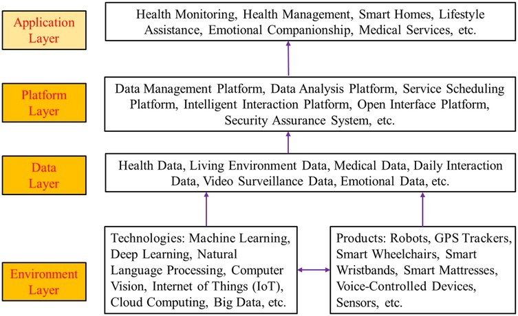 In the past few years, the developed countries have accumulated a great of experience and technology in the field of smart older adult care. They have invented some smart older adult care systems, including the use of sensor technology for real-time monitoring of older adult health data and developing personalized health management plans through data analysis (4). For instance, several technology companies in USA, have successfully created smart home-based older adult care platforms that use smart home devices, sensors, and other technologies to help the seniors' daily lives. Meanwhile, continuous AI theory and technology have been applied in China's older adult care services. The AI-powered products and service systems used in china have enhanced their quality of life and reduced the management costs of older adult care.