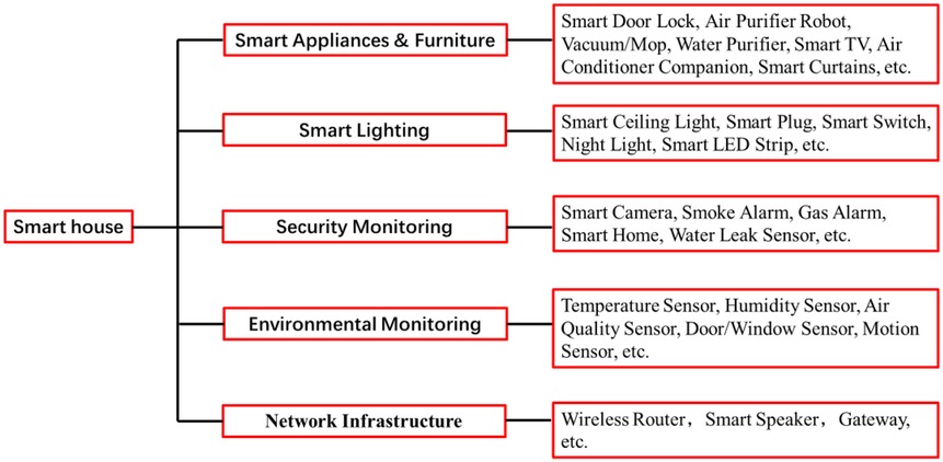 Smart homes have garnered significant attention in China, increasingly playing a vital role in smart older adult care. A smart home primarily comprises five components: network infrastructure, environmental monitoring, security monitoring, smart lighting, and smart appliances and furniture, as illustrated in Figure 2. By utilizing smart home technology, we can provide convenient living services for the older adult. This technology has been identified as a key industry in China's 14th Five-Year Plan, which explicitly promotes the development of comprehensive home intelligence and digital households. According to authoritative forecasts, the smart home market in China is projected to reach 1.2 trillion RMB by 2025, with an annual compound growth rate exceeding 8% (6).