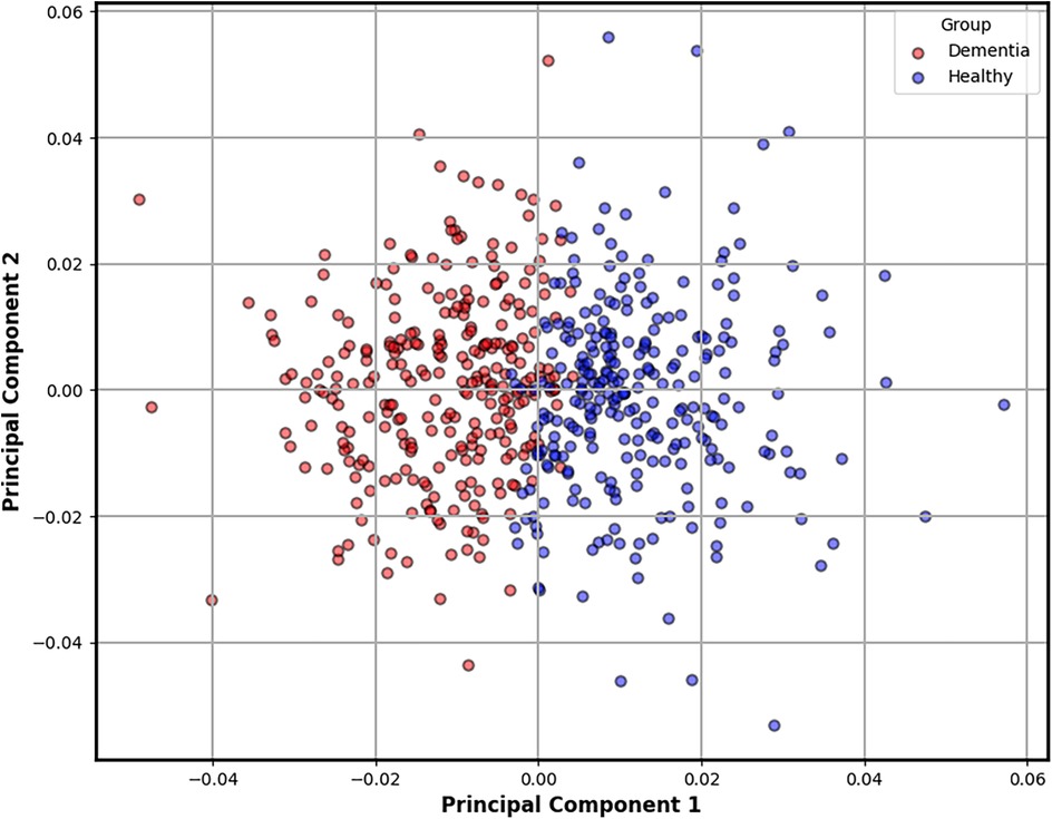 To better understand the geometry of these features, we performed Principal Component Analysis (PCA) on the 27-dimensional steady-state vectors. PCA reduces dimensionality while preserving the directions of greatest variance, enabling clearer visual interpretation. As shown in Figure 4, the resulting projection reveals a striking separation between clusters, with transcripts from dementia subjects forming a more compact and shifted group compared to the wider distribution of controls. This emergent clustering reinforces the hypothesis that cognitive decline alters linguistic dynamics in ways that are both measurable and visually discernible at the character level.