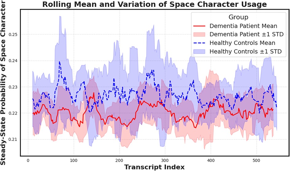 Rolling mean and standard deviation of the space character’s steady-state probability across transcripts. Dementia subjects show elevated means and reduced variance, suggesting more uniform character usage patterns compared to controls. Notably reduced variance, supporting the hypothesis that cognitive decline manifests in more rigid and less adaptive pausing behavior.