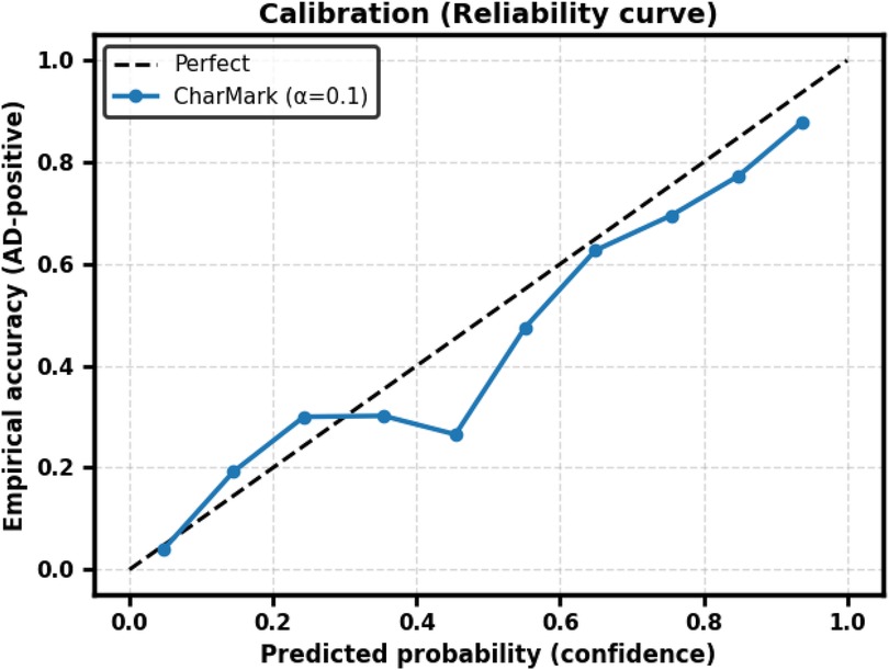 Reliability curve for CharMark (). The dashed diagonal indicates perfect calibration.