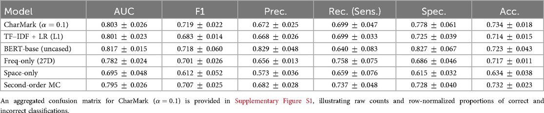 For both baselines we reused the same stratified 5-fold cross-validation splits as for CharMark to ensure an apples-to-apples comparison. We report mean SD across folds for AUC, F1, precision, recall, specificity, and accuracy.