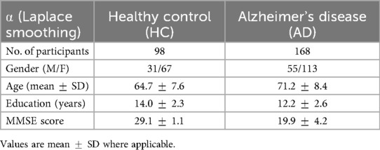 | α (Laplace smoothing) | Healthy control (HC) | Alzheimer’s disease (AD) |