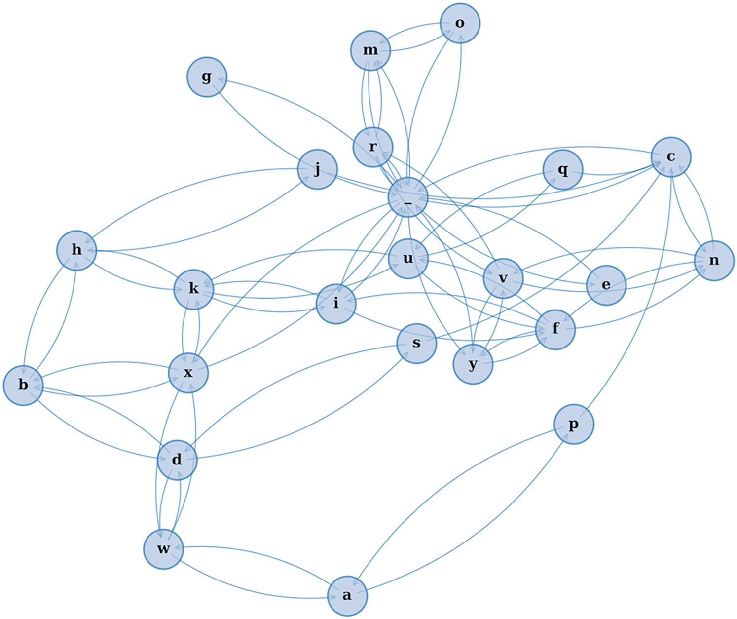 This study introduces a novel modeling framework—CharMark—designed to uncover early linguistic biomarkers of dementia through character-level analysis of speech transcripts. Figure 1 presents a graphical depiction of the Markov network at the heart of our approach, constructed from transitions between characters in recorded speech.