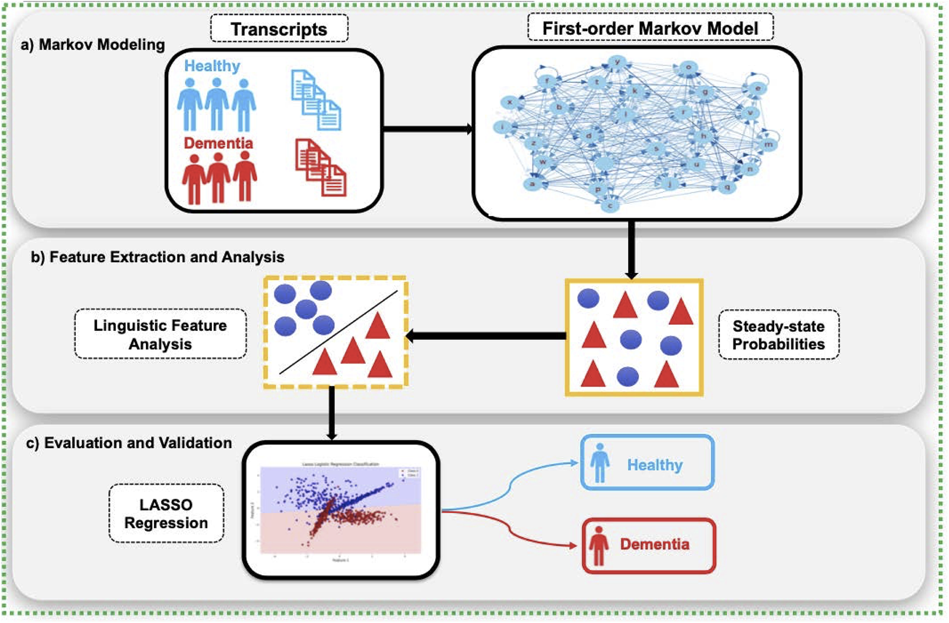 dementia, linguistic biomarkers, Markov model, steady-state probability, speech analysis, interpretable AI, Alzheimer’s disease, character transitions