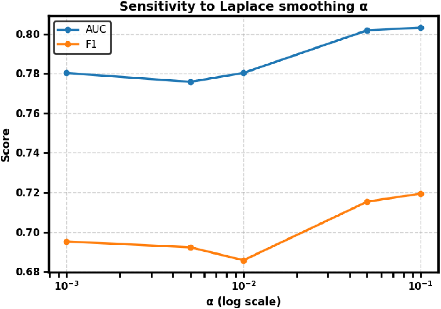 Sensitivity of CharMark to Laplace smoothing parameter . Performance remained stable across the tested range; AUC varied by 0.027 and F1 by 0.035. The default is retained for all main analyses.