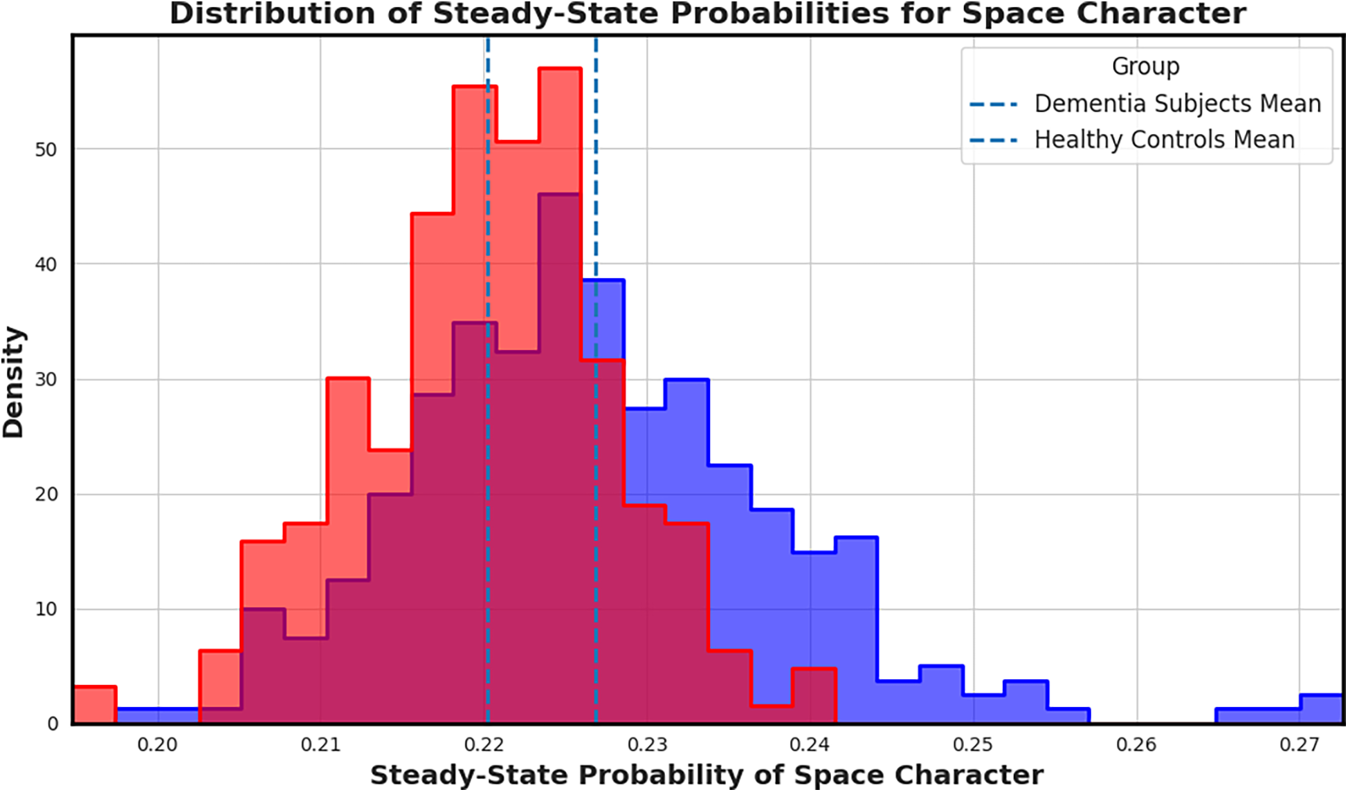 Distribution of steady-state probabilities for the space character across transcripts. Transcripts from individuals with dementia (red) show a clear shift in mean compared to controls (blue), highlighting increased or prolonged pauses that may reflect speech hesitancy or disrupted fluency. Highlighting increased whitespace token usage, which may reflect disrupted fluency patterns.