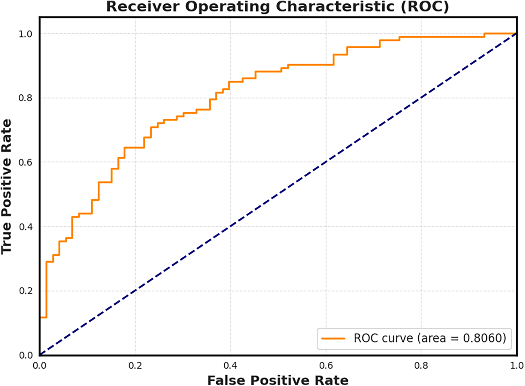 To evaluate the diagnostic potential of our extracted features, we trained a Lasso Logistic Regression model using the 27-dimensional steady-state character vectors. The model was trained in a binary classification setting (dementia vs. control), and the resulting Receiver Operating Characteristic (ROC) curve is shown in Figure 7. The model achieved an area under the curve (AUC) of 0.806, indicating strong discriminative performance from the character-level features alone.