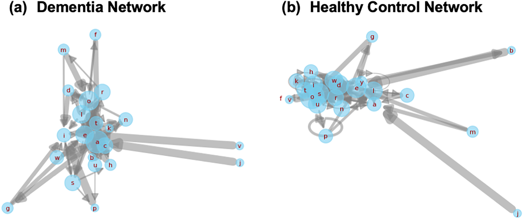 While scalar features like steady-state probabilities offer useful diagnostic signals, structural properties of the underlying transition networks also carry valuable insights into how linguistic rigidity manifests. To qualitatively explore this, we visualized first-order Markov transition networks from two representative transcripts, one from a dementia subject and one from a healthy control (Figure 9).