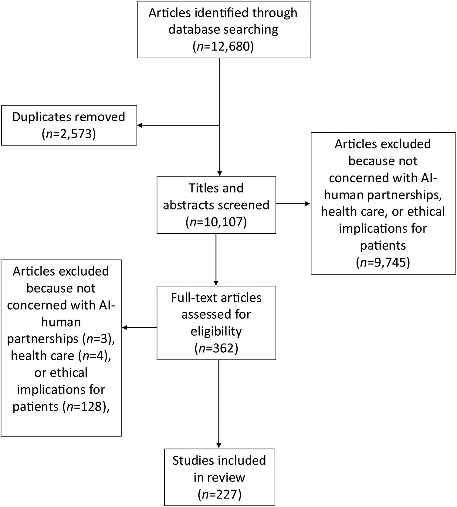Studies included in our review were required to be published or in press in a peer-reviewed journal or conference proceeding in English or have an accompanying English translation and mention AI in healthcare settings in the context of human input or oversight. Broadly, we conceptualized AI in healthcare as a partner to human activity and oversight rather than a sole agent operating independently. In accordance with the qualitative nature of our research question, articles were not required to be empirical in nature; editorials, reviews, and conference proceedings with content more substantial than single-paragraph abstracts were included in the review. To focus our findings on direct ethical implications for patients, we excluded articles that focused only on AI involvement in research paper writing and publishing, clinician education and training, or research that did not involve human participants.