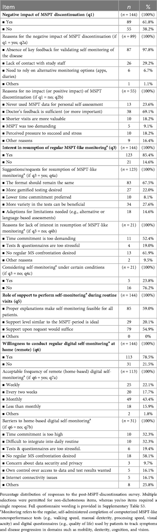Among those who either perceived no negative impact of discontinuation (55/144, 38.2%), were not in favor of resuming MSPT-like digital monitoring (21/144, 14.6%), or declined home-based remote testing (31/144, 21.5%), the most commonly cited reasons were: trust in the (non-MSPT) feedback from their physicians, which they felt was sufficient for disease management; not interested in using MSPT results for patient self-monitoring; time savings by not having to undergo the MSPT; avoidance of regular MS confrontation; and stress associated with testing (Table 2).