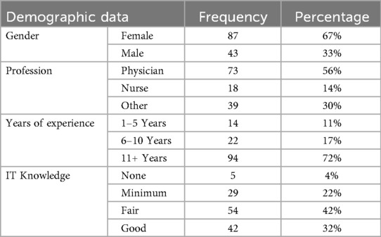 Table 1 displays the demographics of the 130 respondents, where the majority of respondents were Females at 66.9%. Also, profession wise doctors were the most respondents (56%) followed by 30% from various allied health professional backgrounds categorized as other, which demonstrates that the study covered various healthcare professionals' perceptions.