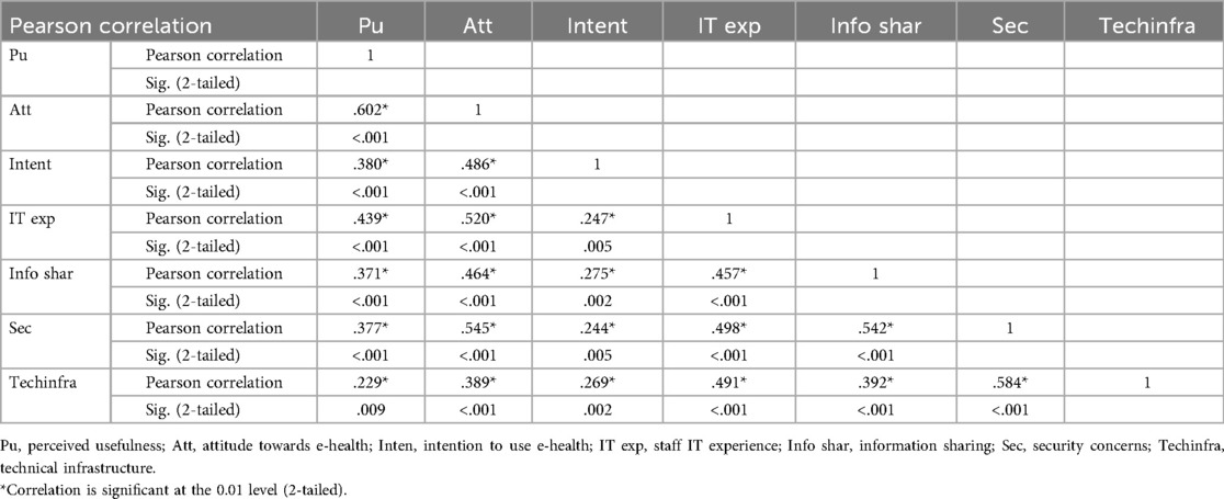 The results of the correlation among the 7 sections were all positively and significantly correlated. The section with the highest correlated value was the correlation between the variable perceived usefulness and the variable attitude towards e-health at (r = 0.602, p < 001), while the lowest correlated variable was the perceived usefulness and technology infrastructure (r = 0.229, p < 0.01).