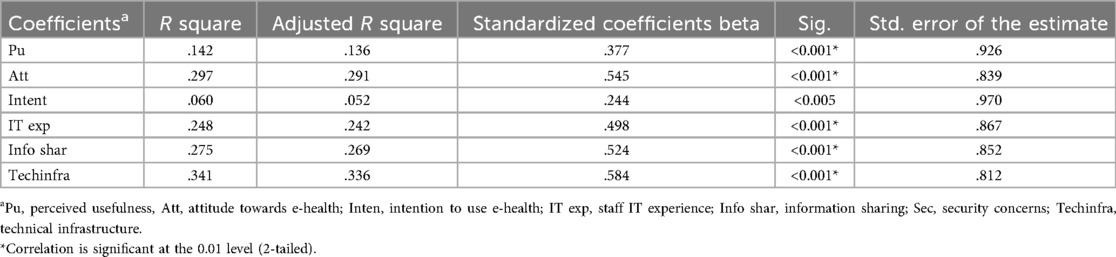 Regression analysis as displayed in Table 3 was used to answer the research questions, to predict how perceived usefulness of e-health technologies impacts intention to use e-health, how security concerns influence the adoption of e-health systems in healthcare organizations and the impact of the availability of technical infrastructure on workers' attitudes towards e-health.