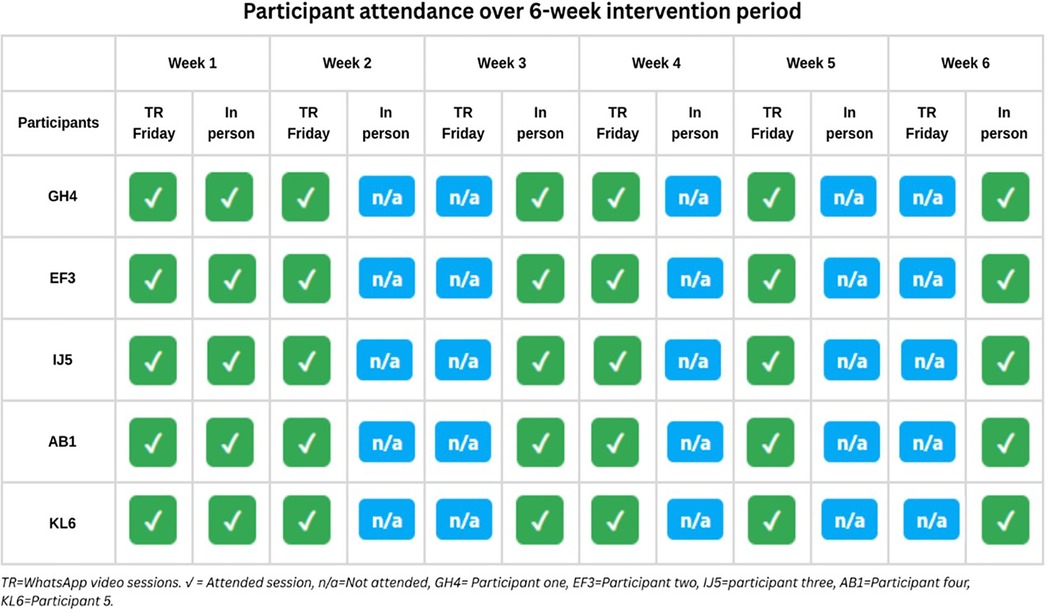 Several methodological limitations must be acknowledged. The small sample size (n = 5), while appropriate for feasibility assessment, limits generalisability and interpretability of results. This limitation was further compounded by the requirement for participants to attend face-to-face sessions at a single facility, which may have excluded potential participants due to geographical constraints. Future studies should include larger, more geographically diverse samples with control groups to validate these preliminary findings.