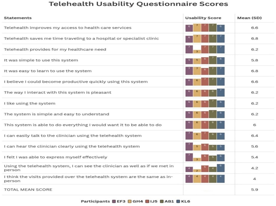 The Telehealth Usability Questionnaire demonstrated high overall satisfaction with a total mean score of 5.9. Participants rated time-saving benefits and ease of learning highest (6.8 each), while visual presence compared to in-person visits scored lowest (4.0–4.2). All participants showed consistently positive responses across usability domains. Figure 2 provides a detailed breakdown of individual and mean TUQ scores.