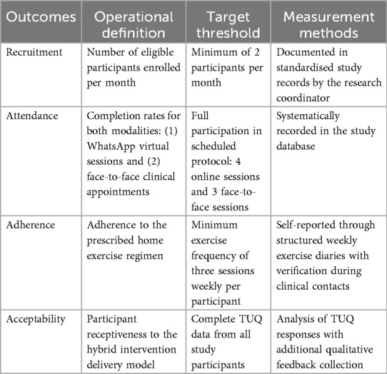 Recruitment metrics were comprehensively evaluated to assess the study's feasibility in enrolling participants from the target population. Total enrolment was documented alongside demographic distributions presented as frequencies and percentages, with detailed tracking of referral sources to identify the most effective recruitment channels. Recruitment efficiency was quantified using the standardized formula proposed by Jaques et al. (27), calculated as the number of enrolled participants divided by the product of recruitment sites and recruitment duration in months, yielding a recruitment rate of 1.176 participants per site per month.
