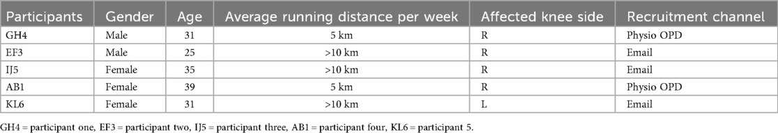 Participant Demographics: The study comprised five participants, with an age range of 25–39 years. The sample included three female and two male participants, all of whom were active runners based in Johannesburg, Gauteng. Of the participants, two engaged in weekly 5 km runs, while the remaining three ran distances of more than 10 kms per week. Table 2 provides a detailed summary of participant demographics, including gender, age, running distance, affected knee side, and recruitment channel.