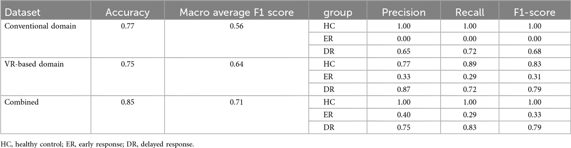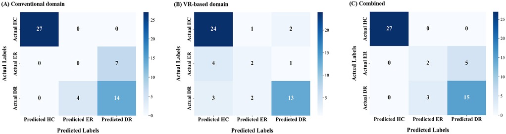 For the conventional domain, the model achieved perfect precision, recall, and F1-score for the HC group but showed no predictive capability for the ER group. Prediction for the DR group was moderate, with a precision, recall, and F1 score of 0.65, 0.72, and 0.68, respectively. The VR-based domain model improved prediction performance for the DR group (precision = 0.87, recall = 0.72, F1 score = 0.79) and demonstrated modest improvements for the ER group, achieving an F1 score of 0.31. When combining both domains, the model maintained perfect prediction for the HC group, while showing improved precision (0.40), recall (0.29), and F1 score (0.33) for the ER group, along with comparable performance for the DR group (precision = 0.75, recall = 0.83, F1 score = 0.79).