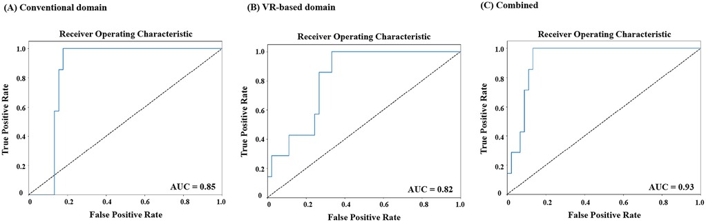 To further analyze the performance of the three-group classification model, we focused on the ER group and evaluated its classification against the combined HC and DR groups. Although the original model was designed for multi-class classification (HC, ER, DR), we extracted results specifically for ER vs. non-ER classifications. This analysis enabled the construction of an ROC curve, representing the model's ability to distinguish ER from the other groups (Figure 2). The ROC analysis highlights the discriminative performance of the model, with AUCs indicating that the combined domain achieved the highest predictive accuracy (AUC = 0.93, Figure 2C). This was followed by the conventional domain (AUC = 0.85, Figure 3A) and the VR-based domain (AUC = 0.82, Figure 3B).