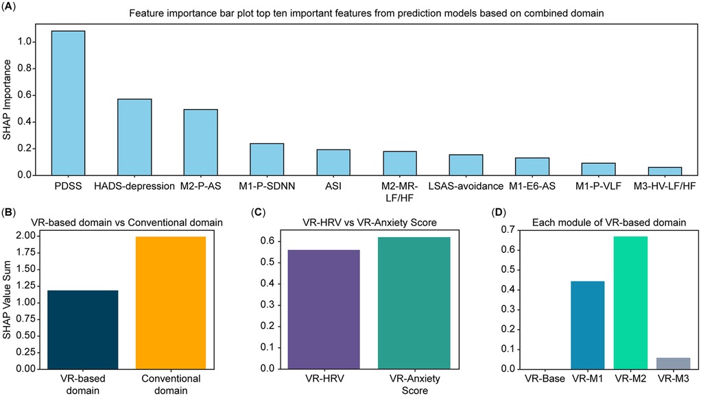 The feature importance analysis, based on SHAP values estimated from the CatBoost model, is presented as a bar plot in Figure 3. Out of 67 features, the top 10 predictors included variables from the conventional domain (PDSS, ASI, depression subscale of HADS, and avoidance subscale of LSAS) and the VR-based domain (M2-P-AS, M1-P-SDNN, M2-MR-LF/HF, M1-E6-AS, M1-P-VLF, and M3-HV-LF/HF). This reflects significant contributions from conventional and VR-based domains. The contribution of each domain, variable category within the VR-based domain, and modules of the VR-based domain to the importance values are visualized in Figures 3B–D, respectively. Across domains, the conventional domain demonstrated a higher importance value sum than the VR-based domain (Figure 3B). Within the VR-based domain, Module 2 yielded the highest importance value sum, followed by Module 1, Module 3, and baseline (Figure 3D). Lastly, among the variable categories in the VR-based domain, AS variables exhibited a higher importance value sum than HRV variables (Figure 3C).