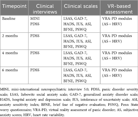 A 6-month longitudinal study design was used to assess treatment outcomes and predict treatment response at 2 months. The study included initial and follow-up in-depth interviews, clinical assessments, and VR-based assessments using the VRA-PD. Over the 6-month period, VR-based and conventional assessments, excluding the baseline MINI, were conducted identically every 2 months. At baseline, participants completed sociodemographic questionnaires and provided clinical history details, including the duration of PD and pharmacotherapy components (Table 1). All patients received routine care, including consultations for prescriptions, but they did not participate in psychotherapy sessions, such as cognitive behavioral therapy or similar therapeutic interventions. To account for antidepressants affecting PD treatment outcomes, standardized daily antidepressant doses were recorded by converting them into fluoxetine-equivalent doses following the methodology of Hayasaka et al. (22). For example, 40 mg/d of fluoxetine corresponded to 34.0 mg/d of paroxetine and 18.0 mg/d of escitalopram.