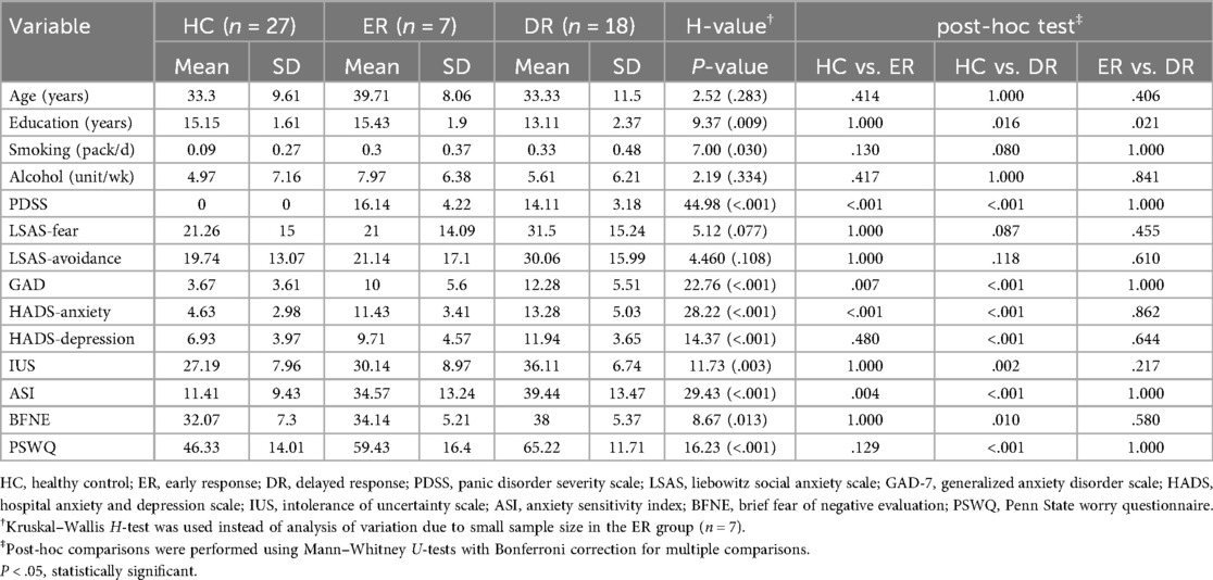 The demographic and clinical characteristics of each group are summarized in Table 2. Among demographic variables, only years of education showed a significant difference across groups (H = 9.37, P = 0.009). In terms of anxiety-related measures, all scales except for the LSAS revealed significant differences between groups. post-hoc analysis indicated that compared to the HC group, the ER and DR groups exhibited significantly higher symptoms of PD as measured by the PDSS. Specifically, the DR group scored significantly higher than the HC group on all anxiety-related measures except for the LSAS. In contrast, the ER group differed significantly from the HC group only on the GAD-7, the anxiety subscale of the HADS, and the ASI. No significant differences were observed between the ER and DR groups on any anxiety-related measures, except for years of education, where the ER group had relatively higher educational levels.