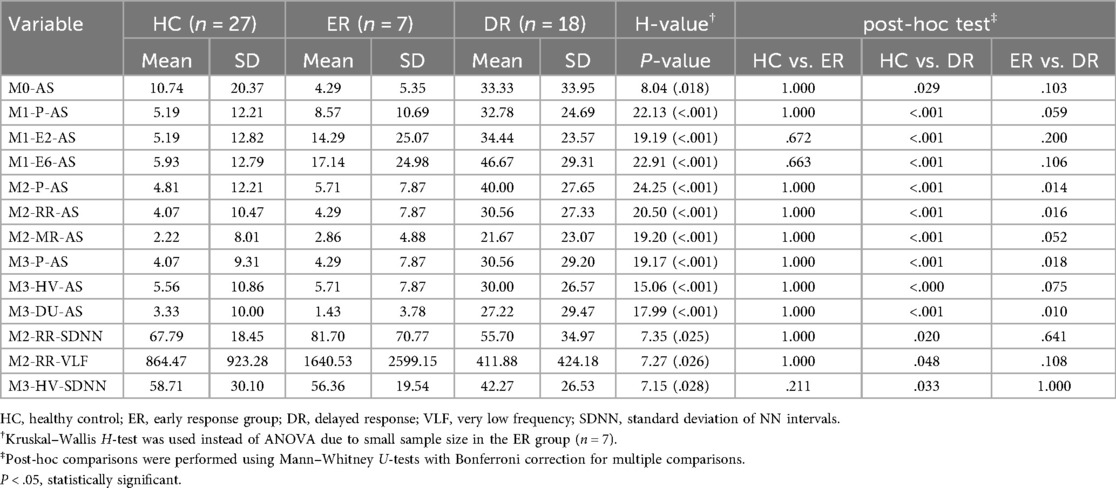 Three HRV parameters showed significant differences across groups: M2-RR-SDNN, M2-RR-VLF, and M3-HV-SDNN. In particular, M2-RR-SDNN and M2-RR-VLF were significantly lower in the DR group compared to the HC group (P = 0.020 and 0.048, respectively), while no significant differences were observed between ER and DR groups after Bonferroni correction. Similarly, M3-HV-SDNN was lower in the DR group than in the HC group (P = 0.033), but not significantly different between ER and DR. These findings suggest that reductions in autonomic flexibility during VR-based interoceptive or relaxation tasks may be associated with delayed treatment response.