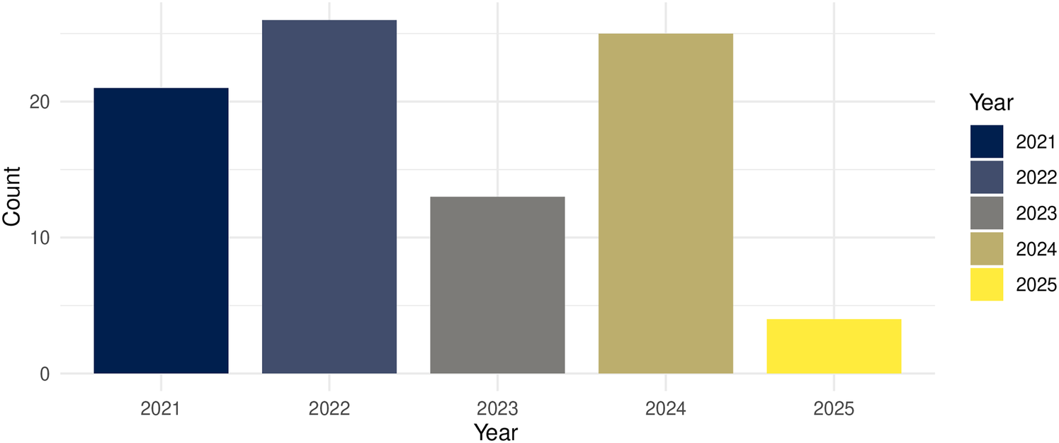 This quantitative layer established the structural overview of the field and guided the thematic coding process for the narrative synthesis.