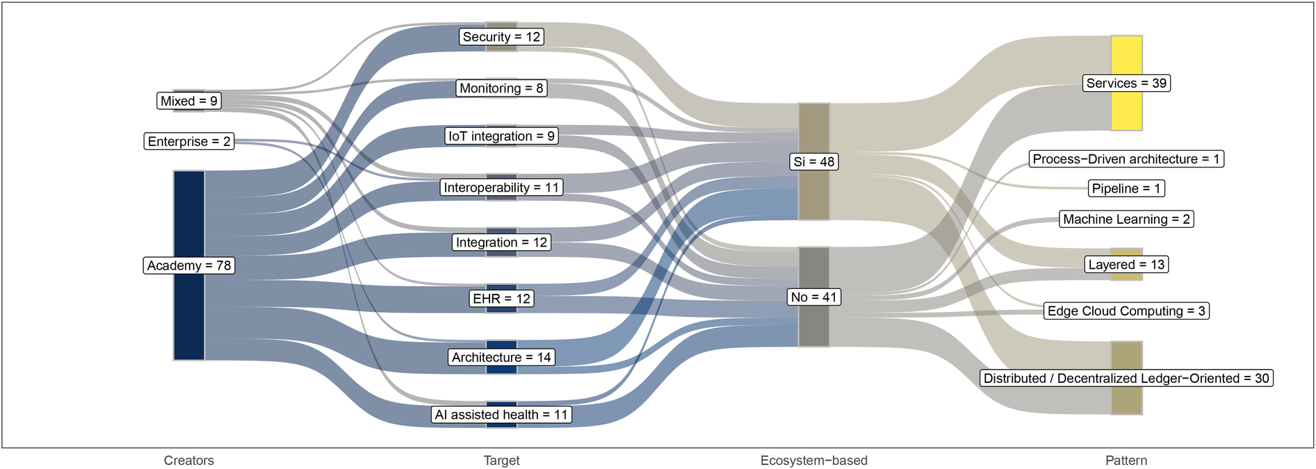 Nevertheless, the adoption of best practices in real-world healthcare contexts remains inconsistent, and the extent to which these approaches support ecosystem-level principles such as openness, sustainability, and cross-border integration remains unclear. Furthermore, while reference models such as HL7 and open EHR have emerged as interoperability enablers, there is limited evidence on how these standards are combined with architectural strategies in complete production environments. A critical knowledge gap persists regarding which patterns dominate current HIS designs, which ones are emerging, and whether these architectures align with the requirements of complex digital health ecosystems, such as those conceptualized under Software Ecosystem (SECO) and System-of-Systems (SoS) paradigms.