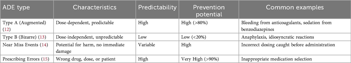 Table 1 demonstrates the classification and characteristics of adverse drug events. ADEs can be systematically classified into two primary categories: Type A (augmented) and Type B (bizarre) reactions (12). Type A reactions are dose-dependent and predictable, frequently resulting from medication errors such as incorrect dosing, inappropriate frequency, or excessive duration of therapy. These errors are largely preventable through implementation of proper prescribing protocols and enhanced monitoring systems (13). Type A reactions are commonly associated with frequently prescribed medications and often involve prescribing errors, making their reduction a critical clinical priority (14). Type B reactions are unpredictable and dose-independent, typically involving allergic or idiosyncratic responses. While these reactions are more challenging to prevent due to their unpredictable nature, proper patient history taking, allergy documentation, and genetic testing (where applicable) can reduce their incidence (15).