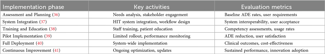 The initial step in SCDS implementation involves identifying clinical areas where the intervention can achieve maximum impact (42). This process typically involves analyzing ADE surveillance data to identify high-risk medications, vulnerable patient populations, and clinical settings with elevated risk profiles. Implementing SCDS in chronic disease management, such as diabetes, hypertension, and cardiovascular disease, where medication regimens are complex and ADE risk is elevated, often provides substantial benefits.