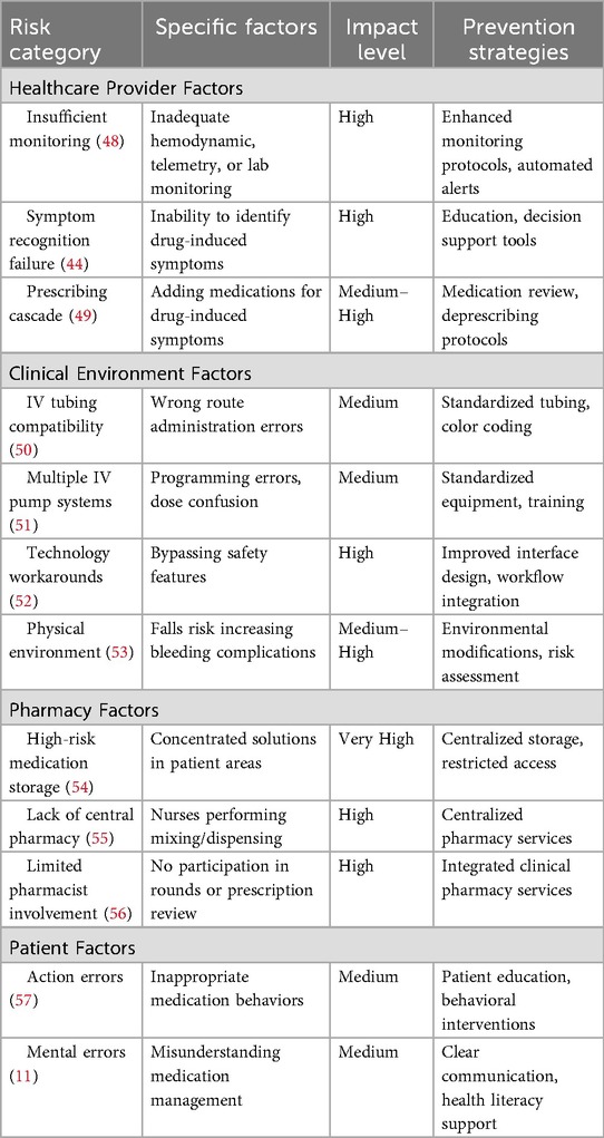 The healthcare environment contains numerous interconnected factors that contribute to ADE occurrence, many of which are not unique to specific patient populations. Understanding these systemic challenges is essential for developing effective prevention strategies. Table 4 presents the risk factors for adverse drug events.