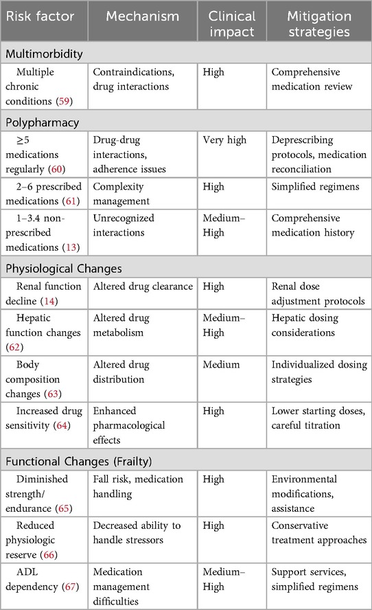 While the aforementioned risk factors affect all patient populations, geriatric patients face additional, population-specific risks that significantly increase their ADE susceptibility compared to younger adults (13). The association between advanced age and increased ADE rates stems from multiple interconnected factors, including increased comorbidity burden, polypharmacy, physiological changes, and functional decline or frailty. Table 5 demonstrates the geriatric-specific risk factors for adverse drug events.