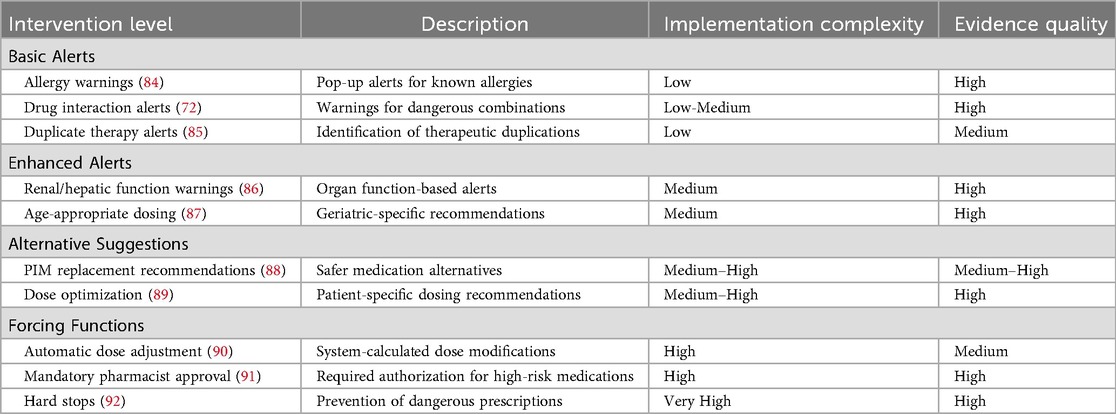 However, the effectiveness of basic alert systems remains controversial in the literature. While some studies report significant reductions in prescribing errors with basic alerts, others document high override rates (49%–96% for drug interaction alerts) that substantially diminish their impact (85, 95). This discrepancy likely reflects differences in alert specificity, clinical relevance, and integration with clinical workflows. Studies with lower override rates typically employed more selective alerting strategies, limiting alerts to high-severity interactions and incorporating clinical context into alert triggering logic (85, 96).