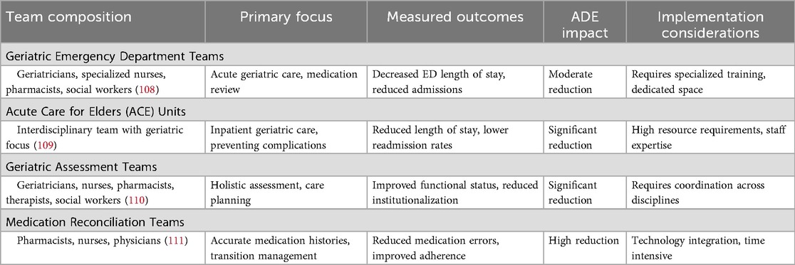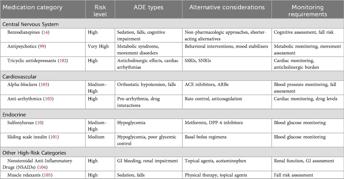 The American Geriatrics Society Beers Criteria is a widely recognized tool that specifies potentially inappropriate medications (PIMs) for use in geriatric patients, aiming to reduce adverse clinical outcomes, hospitalizations, mortality, and health care costs associated with these medications (98). The Beers Criteria lists medications that are particularly risky for older adults due to their association with ADEs (99). This list helps mitigate risks related to the physiological and functional changes that occur with aging by identifying medications that are specifically linked to adverse events in geriatric patients. These changes include reduced organ function, altered pharmacokinetics, and increased vulnerability to drug side effects. However, the Beers Criteria also highlights a common knowledge gap among health care providers who are not geriatric specialists, as many medications deemed inappropriate for older adults may be safe for younger populations. While the Beers Criteria provides valuable guidance, it is primarily an educational tool and, as such, is inherently less effective than other interventions that actively enforce safer prescribing practices. Moreover, the Beers Criteria addresses only a fraction of the overall risk, as Beers Criteria medications are implicated in only 16.5% of geriatric ADEs (100). Despite its limitations, the Beers Criteria represents an important first step in addressing ADEs in geriatric patients by targeting providers' knowledge gaps. Table 7 demonstrates the American Geriatrics Society Beers Criteria for High-Risk Medication Categories (101).
