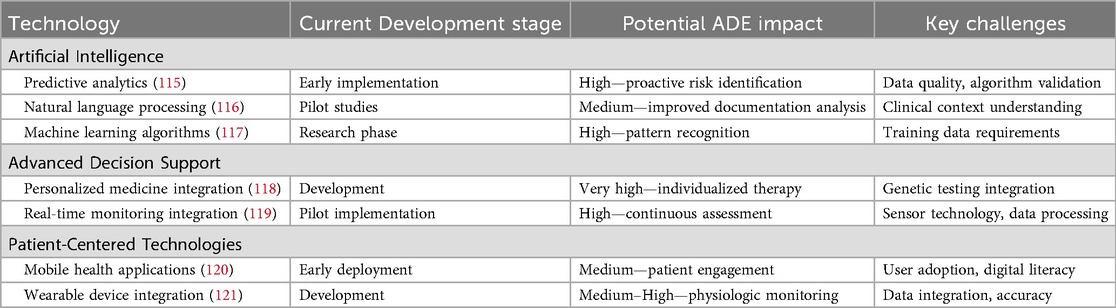 Despite these alarming statistics, the true prevalence of ADEs likely represents a significant underestimation due to systematic underreporting and limitations in current detection methodologies. Healthcare systems predominantly rely on voluntary reporting mechanisms and error tracking systems, which capture only a fraction of actual events. Conservative estimates suggest that merely 10%–20% of medication errors are formally reported, indicating that the actual scope of ADEs may be five to ten times greater than currently documented (9). The consequences of ADEs extend far beyond immediate clinical presentations, encompassing significant morbidity and mortality outcomes. Beyond the direct health impacts, ADEs precipitate increased healthcare utilization patterns, elevated treatment costs, and diminished functional status for affected patients (7). The economic burden includes direct costs associated with additional treatments, extended hospitalizations, and emergency interventions, as well as indirect costs related to lost productivity and reduced quality of life.